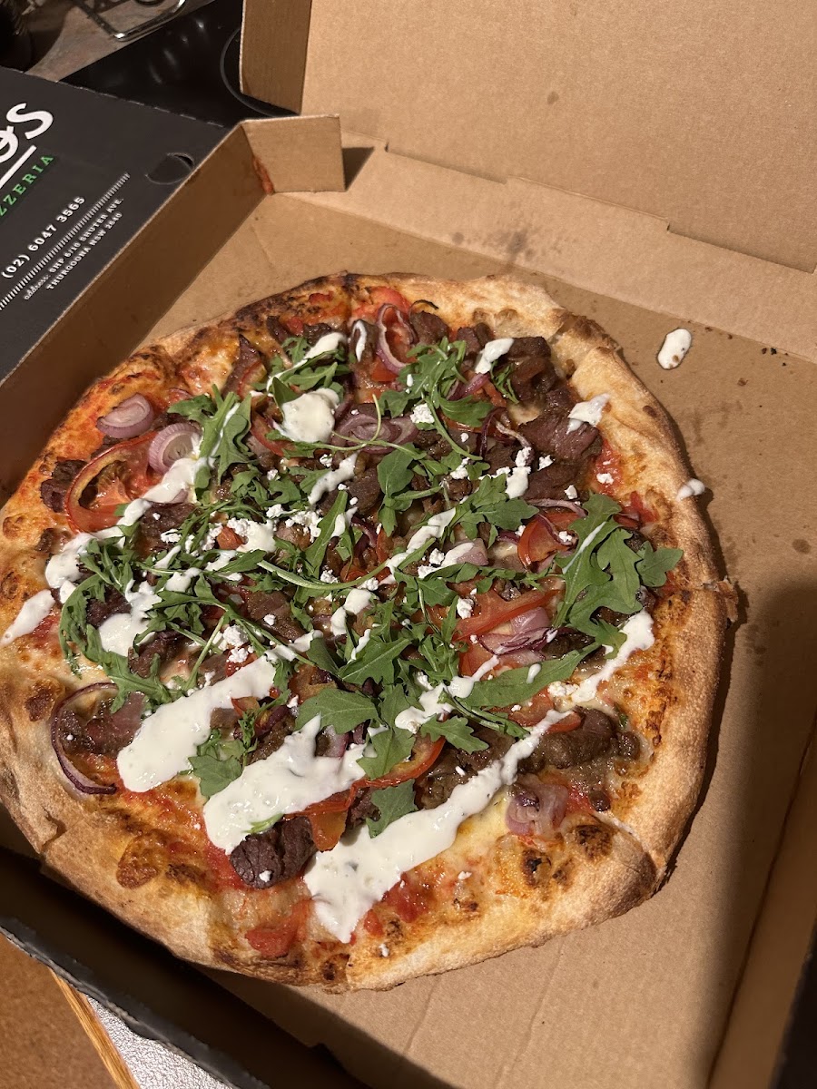 Tomato base, mozzarella, lamb, red onion, sliced tomatoes, tzatziki, feta and rocket.