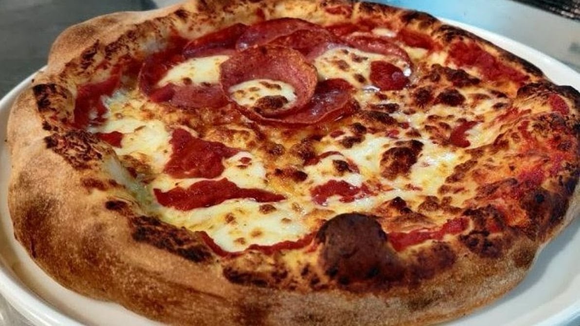 Tomato base, mozzarella, olives, anchovies and oregano.
